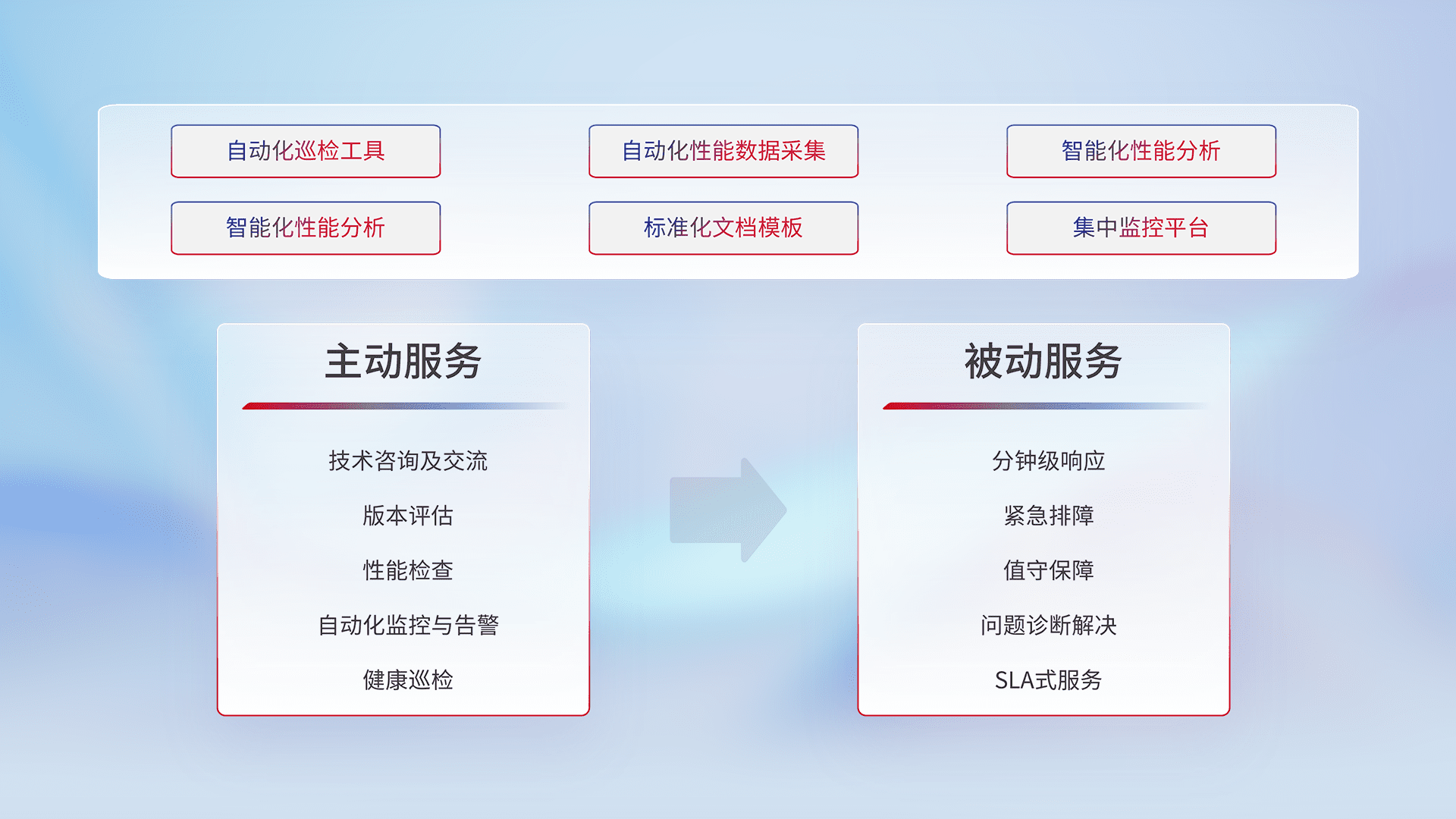 智能化工具和标准化文档,,,,保障服务质量,,,,提供主动服务(包含技术咨询、、、、版本评估、、、性能检查、、自动化监控与告警、、、、健康巡检)和被动服务包含(分钟级响应、、、紧急排障、、、、值守保障、、问题诊断解决、、SLA服务)。。。